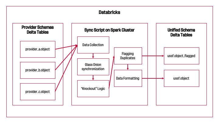 We collect data from the provider-specific tables into a single Spark DataFrame with the schema: - data_provider: the data provider's name - provider_object_id: the ID of the object in the data provider's system - Any object-specific columns to use for synchronization - A grouping key (More on this in Step 2)